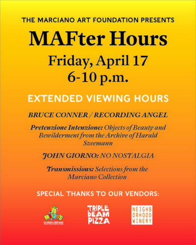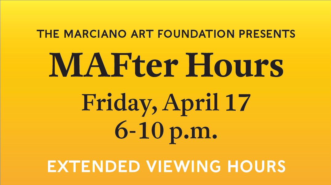 On Friday, April 17 from 6-10 p.m., the Marciano Art Foundation is pleased to present the inaugural “MAFter Hours,” a special evening of extended viewing hours at the Foundation.