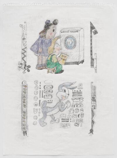 In the exhibition Magdalena Suarez Frimkess: Ninety-six and Pissed, the Library at MAF presents a selection of over thirty new drawings alongside the artist’s earlier iconic drawing Wonder Woman (2007) and a representative selection of her hand-built ceramic sculptures. Taking their cue from Wonder Woman, Suarez Frimkess’s rendition of the 2006 United States Postal Service stamp celebrating the comic book superheroine surrounded by a constellation of cartoon characters, her new drawings bring together a wide-ranging cast of “caracteres” (as she proclaims in Spanish in one of the works). Olive Oyl, Bluto, Wimpy and Popeye make appearances throughout these works; Bugs Bunny becomes part of an Egyptian hieroglyph; Charlie Brown, Snoopy and the Peanuts gang splash about in a kiddie pool while a Celtic bird gazes upon them from above.