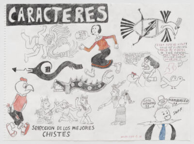 These characters appear every which way across these drawings alongside iconographic representations of figures and designs from the pre-Columbian Moche art of Peru, Egyptian hieroglyphics, Hellenistic black pottery figures and Celtic runes in a particular Suarez Frimkess-esque illustrative mash-up that irreverently crosses genres, continents and centuries. In effect, Suarez Frimkess has used her pencils to create a kind of free-floating pictorial cocktail party in which characters and symbols move freely between different drawings chatting each other up while paying little attention to stodgy art historical boundaries or traditions. Throughout these drawings, Condorito makes repeat appearances, impishly weaving his way amongst this crowd and giving a farcical emphasis to her frustrations with his frequent and emphatic slap stick exclamation ¡PLOP!. As she has noted many times, “Condorito is my philosopher.”